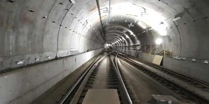 View inside a train tunnel showing railway tracks and the curved ceiling with construction equipment.