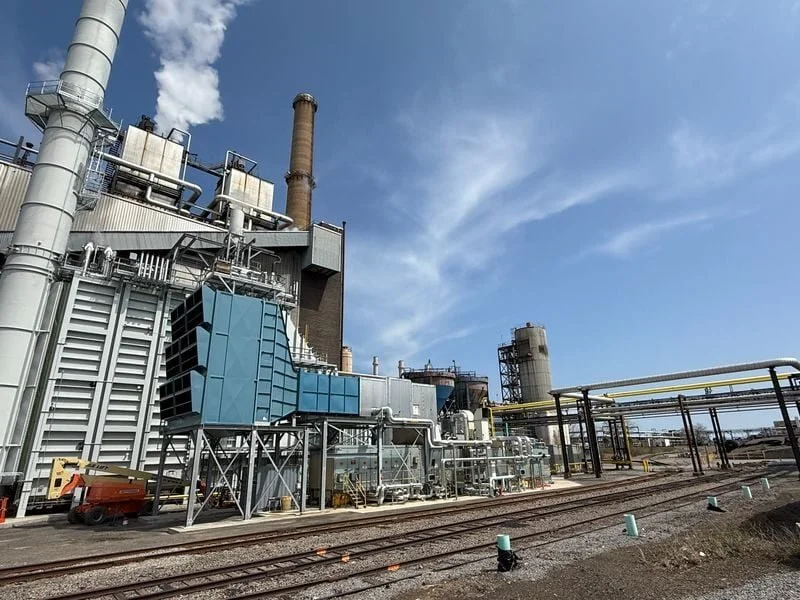 Aerial view of an industrial facility near a water body, surrounded by forested and cleared land.