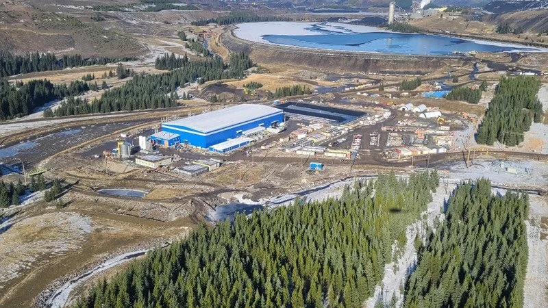 An industrial mining facility with conveyor belts and structures set against a mountainous landscape with cloudy skies.