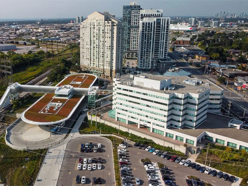 A digital rendering of a modern urban transit station with a light rail train and bus stops, surrounded by commercial buildings and trees.