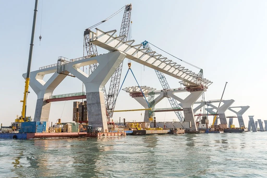 A large steel bridge with tall triangular supports spans over a body of water under a partly cloudy sky.