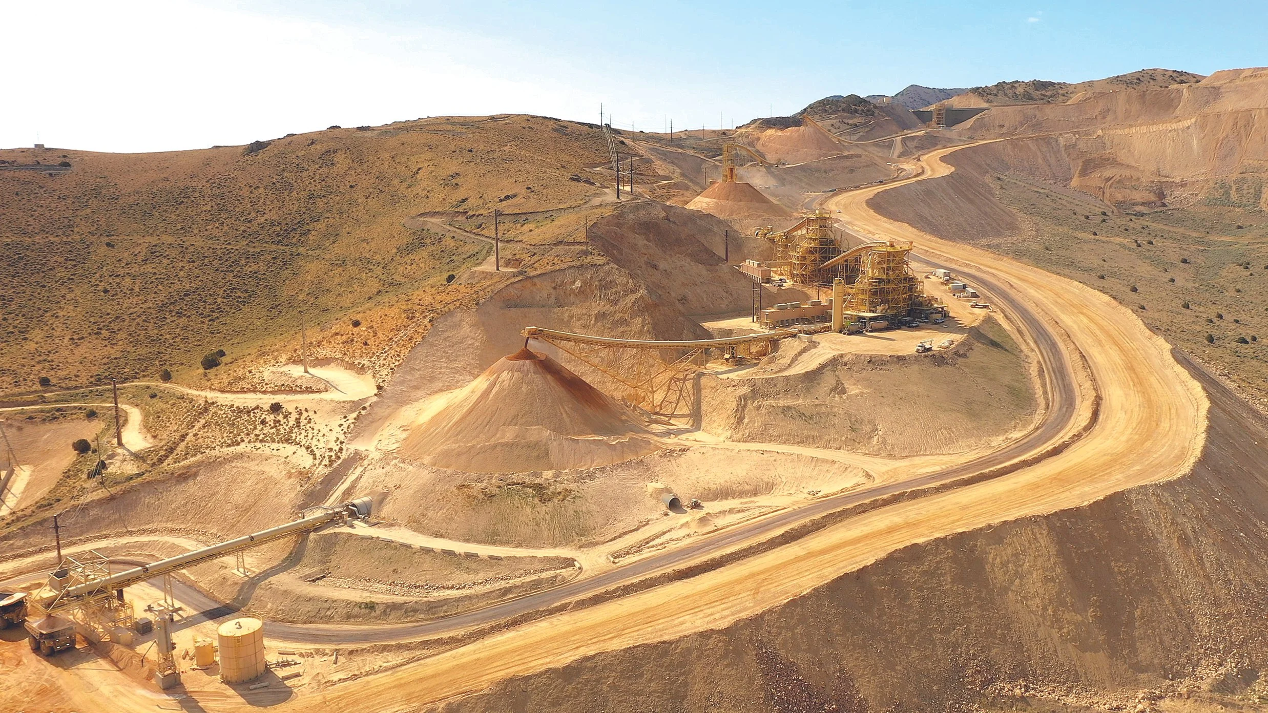 An open-pit mining site with large piles of extracted minerals, winding roads, and industrial machinery in a hilly, semi-arid landscape.