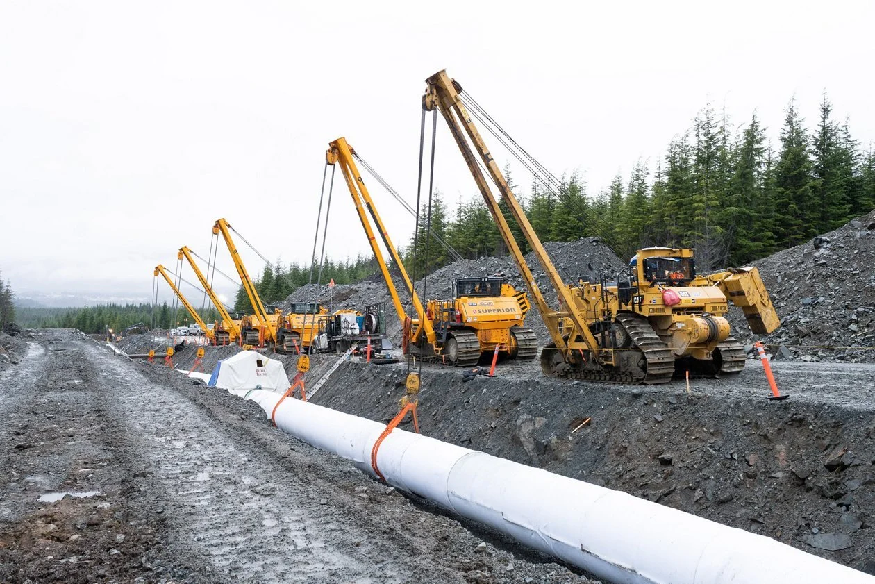 Construction workers install large pipeline sections in a snowy landscape with trees, mountains, and overcast sky in the background.