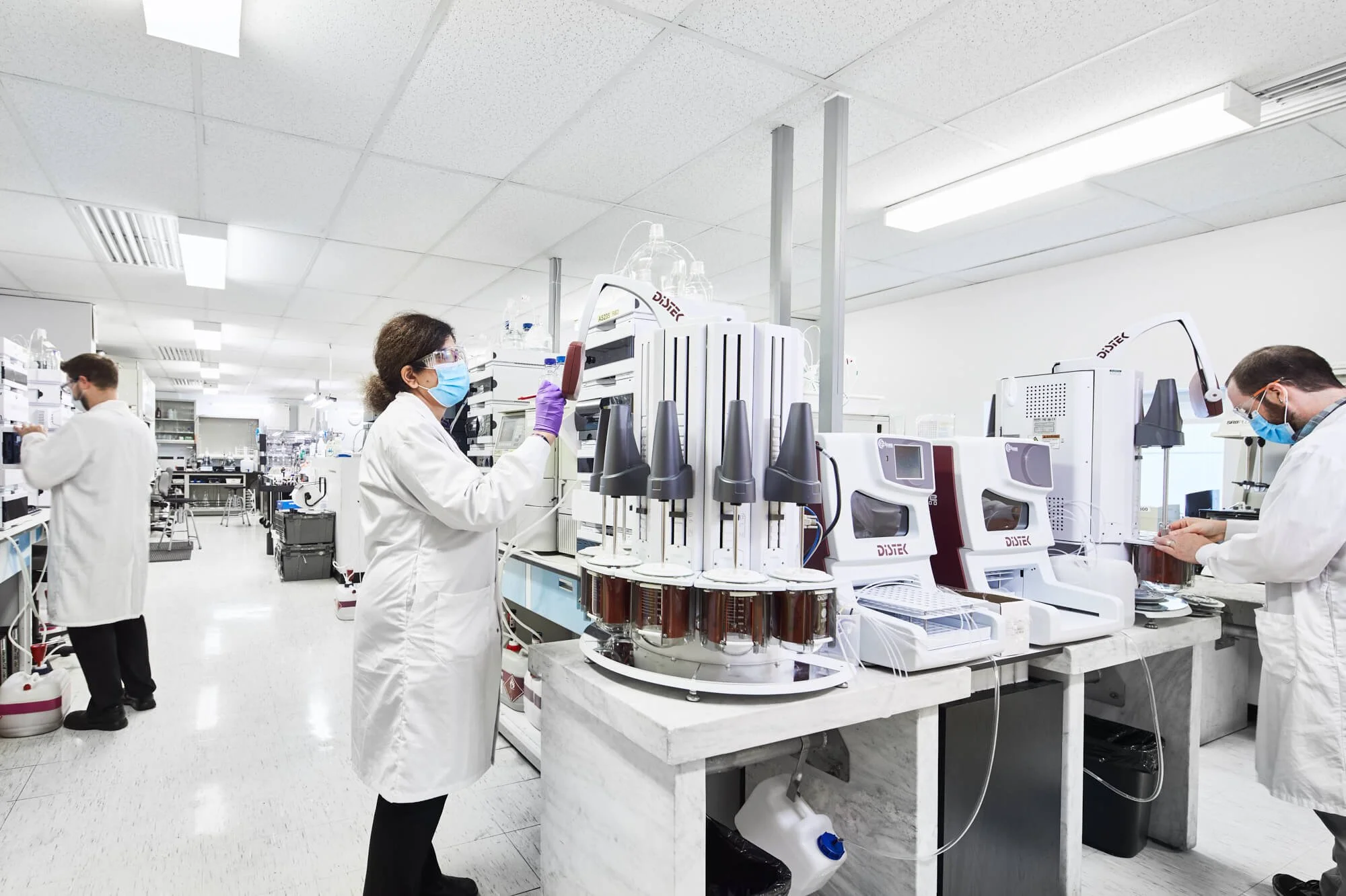 Scientists working with laboratory equipment in a clean, bright laboratory. They are wearing white lab coats, face masks, and gloves, and are engaged in scientific experiments or analysis.